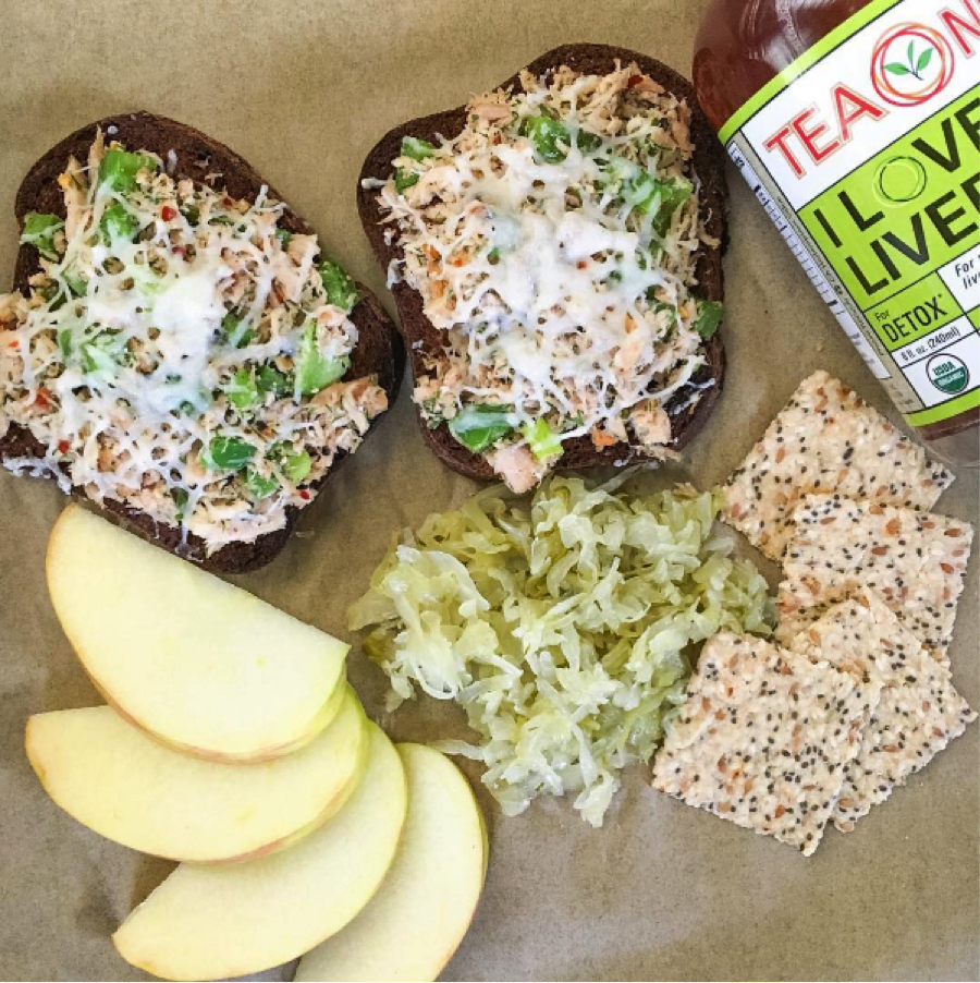 Directions: Make tuna salad by mixing albacore tuna with diced green bell pepper, lemon juice, avocado oil, chopped green onion, red pepper flakes, ground pepper, and dill. Toast both slices of bread. Top the toast with tuna and shred the sharp cheddar goat cheese over the top. Place on parchment paper and then into the oven (center rack) on broil to melt the cheese. Great with sauerkraut and Honey Crisp apple slices! Click here for recipe credit and inspiration.